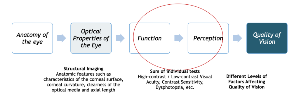 Measuring the quality of vision is not only about how a person perceives a situation, but it is a more complex approach that aims to measure how the person lives the own vision in a specific context where different visual mechanisms are involved.